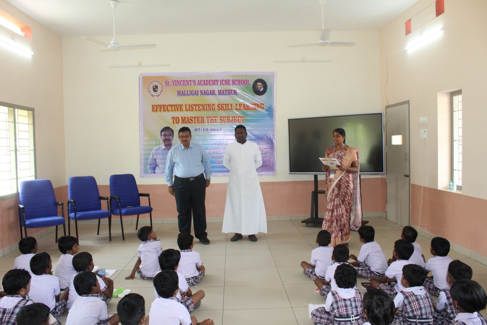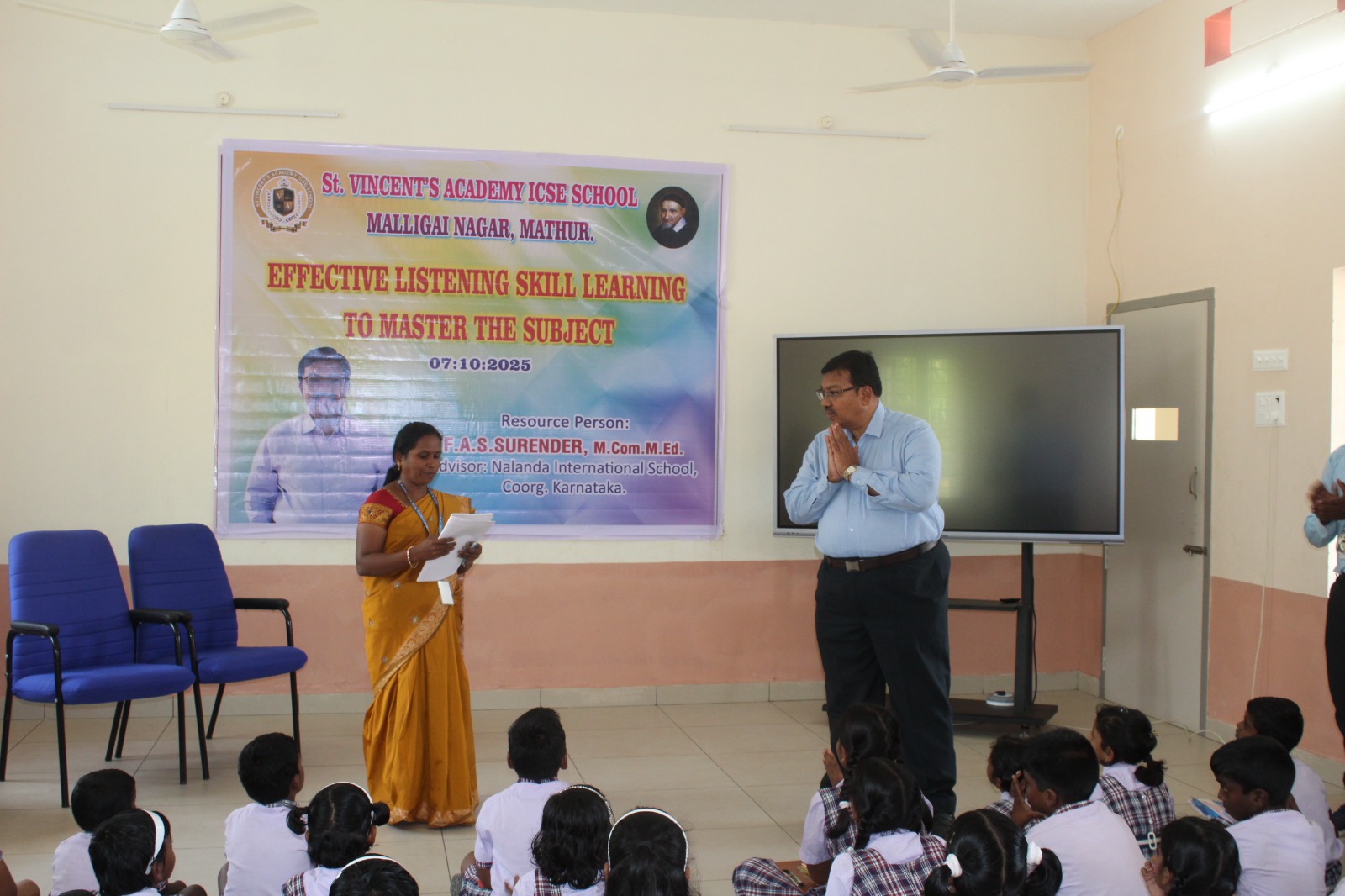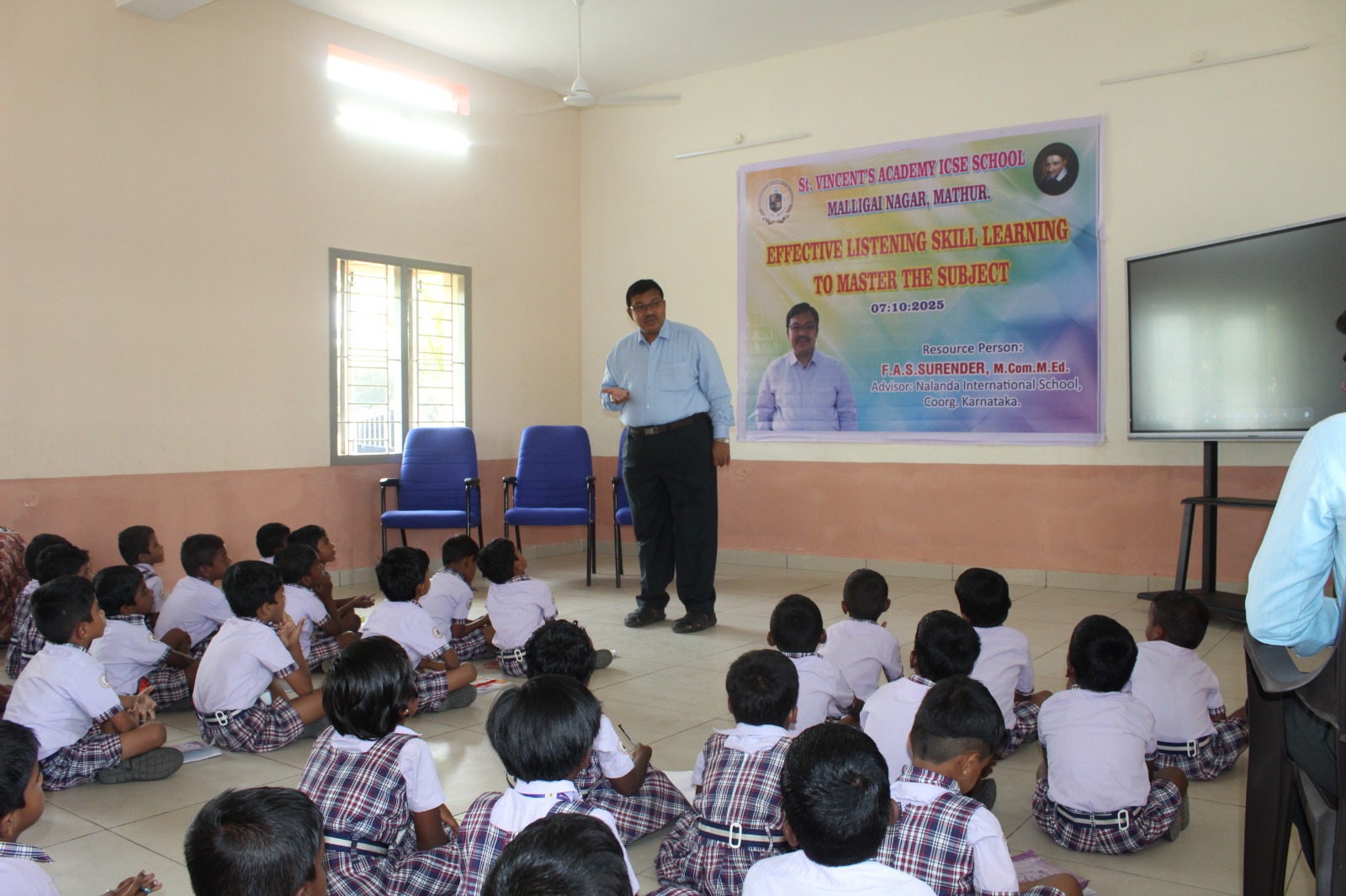 Today, we were honored to have F.A.S.Surender M.com,M.Ed ,Advisor of Nalanda International School,Coorg,Karnataka amidst us who enlightened us about importance of listening and concentration. Interaction of the students made the session even more useful.